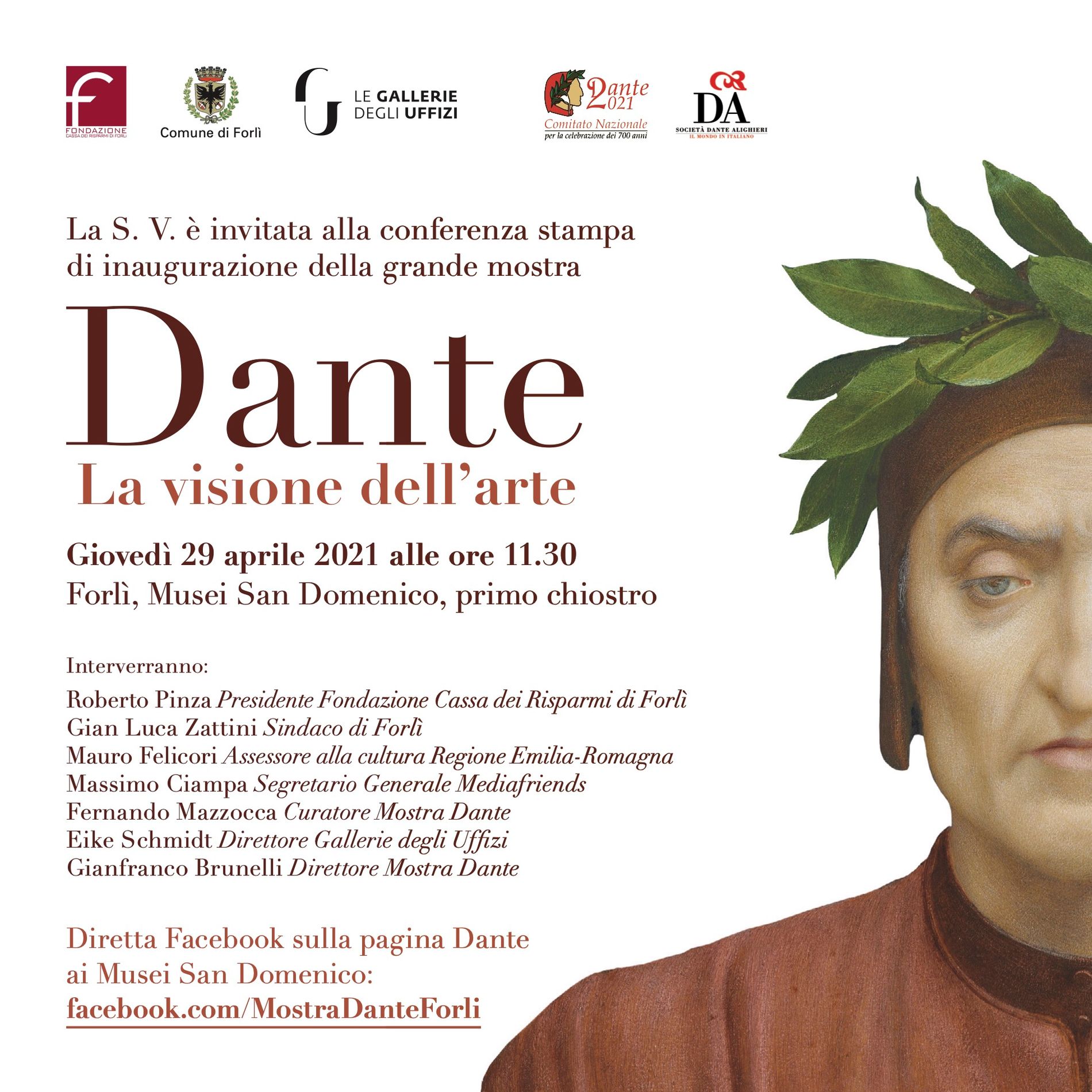 Interverranno: Roberto Pinza, Presidente Fondazione Cassa dei Risparmi di Forlì Gian Luca Zattini, Sindaco di Forlì Mauro Felicori, Assessore alla Cultura e Paesaggio Regione Emilia Romagna Massimo Ciampa, Segretario Generale Mediafriends Fernando Mazzocca, Curatore Mostra Dante Eike Schmidt, Direttore Gallerie degli Uffizi Gianfranco Brunelli, Direttore grandi mostre Fondazione Cassa dei Risparmi di Forlì