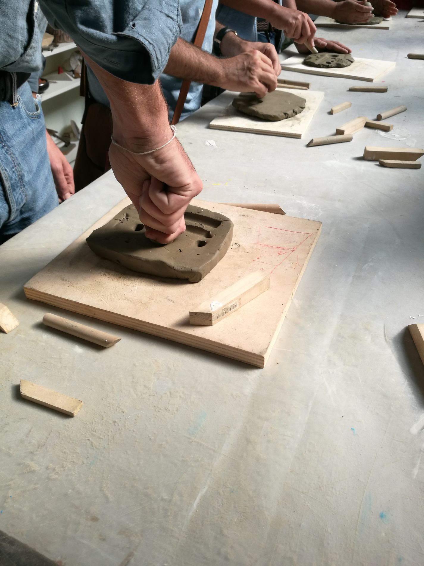 La tecnica di lavoro in negativo con la quale Arnaldo Pomodoro realizza le sue sculture, imprime su un piano di argilla i segni astratti della sua “scrittura” immaginando già la forma finale. Dall'argilla si realizza una matrice in cui far colare il gesso che asciugato diventa un piccolo bassorilievo.