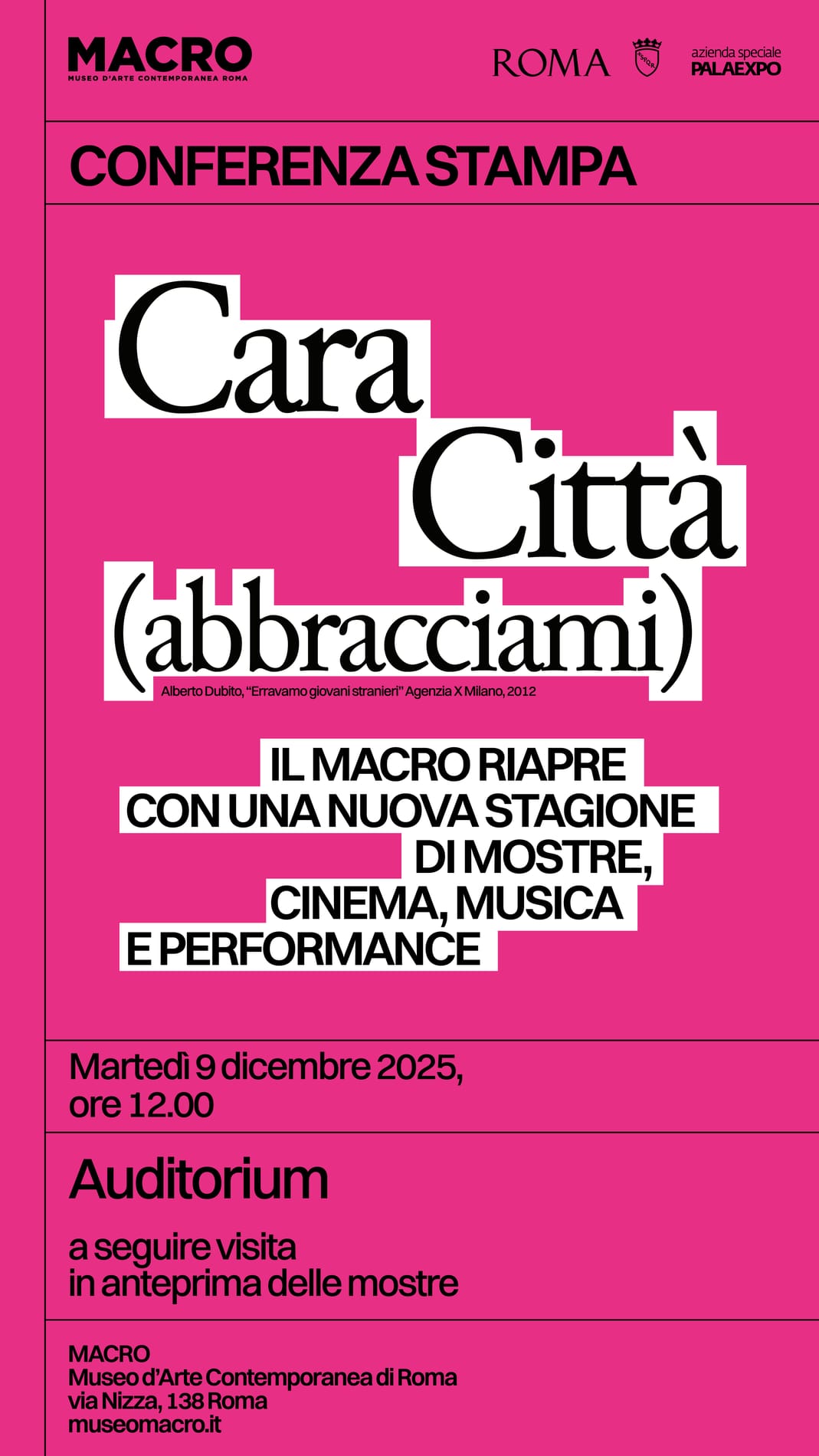 Dall’11 dicembre il Museo d’Arte Contemporanea di Roma riapre la stagione espositiva con la nuova direzione artistica di Cristiana Perrella e un ricco palinsesto che comprende quattro mostre e un programma che, tra arti visive, musica, cinema e urbanistica, rende omaggio alla città componendo un racconto che la proietta oltre i suoi confini. Le mostre in apertura sono: UNAROMA a cura di Luca Lo Pinto e Cristiana Perrella, One Day You’ll Understand. 25 anni da Dissonanze a cura di Cristiana Perrella, Jonathas de Andrade. Sorelle senza nome a cura di Cristiana Perrella in collaborazione con Conciliazione 5 e Fondazione In Between Art Film, e Abitare le rovine del presente a cura di Giulia Fiocca e Lorenzo Romito (Stalker). Una stagione espositiva interamente dedicata alla Città Eterna, alla sua scena artistica e alle energie creative che la animano. “Immagino il MACRO come un organismo composito, flessibile e accogliente, che respira con la città e ne restituisce il ritmo, le contraddizioni e le potenzialità. Roma è un luogo di inesauribile produzione di senso, dove arte, musica, cinema e pensiero si intrecciano generando forme sempre nuove di dialogo. Il museo deve essere capace di rispecchiarne la complessità e allo stesso tempo di proiettarla verso il mondo”. (Cristiana Perrella). Partecipa alla conferenza stampa martedì 9 dicembre alle 12.00! Solidarietà e impegno sociale
